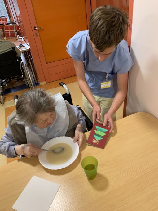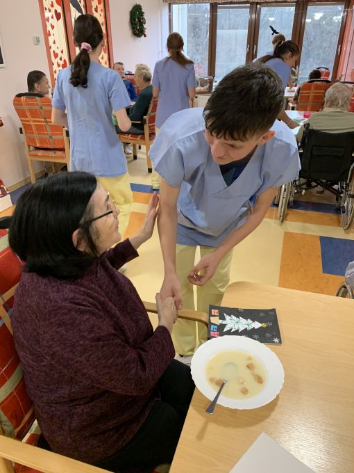 Pečovatelé vyhodnotili soutěž o nejkrásnější vánoční přání a bylo rozhodnuto, že všechna přáníčka putují seniorům střediska Helios. Tato přáníčka předávali osobně našim seniorům žáci oboru pečovatelské služby za doprovodu své paní učitelky odborného výcviku Mgr. Lenky Mikové. Seniorům udělali velkou radost nejen krásnými a rozmanitými přáníčky, ale především svou přítomností a úsměvem na tváři.