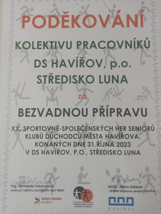 Nicméně důležité není vyhrát, ale zúčastnit se a strávit příjemné odpoledne. Tímto gratulujeme všem zúčastněným. Děkujeme hostům za účast: vedoucí sociálního odboru MmH Ing. Bernarda Urbancová, kronikářka města Havířova Bc. Hana Dvořáková, manažerka sociálních služeb MmH p. Michaela Václavková. Za Domov seniorů: vedoucí střediska Mgr. Eva Džupin, vedoucí ekonomického útvaru Ing. Renáta Kochová, vedoucí zdravotního útvaru Bc. Naděžda Buriánová. Dík patří všem zaměstnancům Domova seniorů a Magistrátu města Havířova, jež se na přípravě a realizaci podíleli. Děkujeme